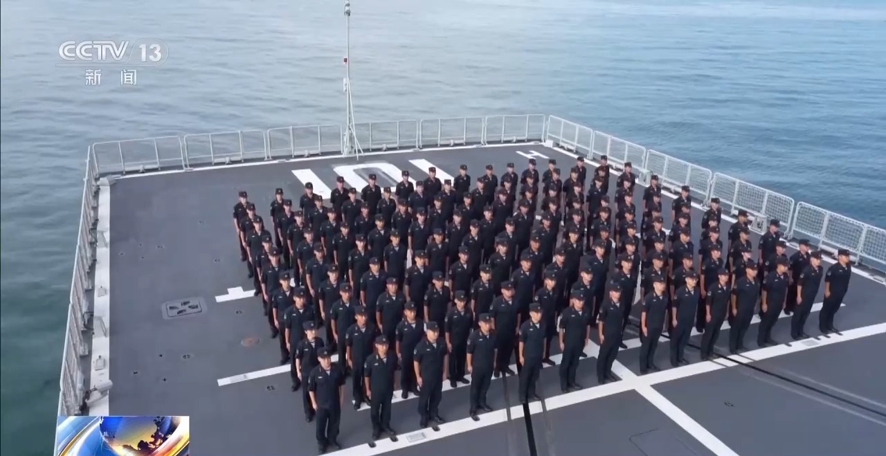 正在黄海某海域执行任务的海军南昌舰举行升旗仪式,