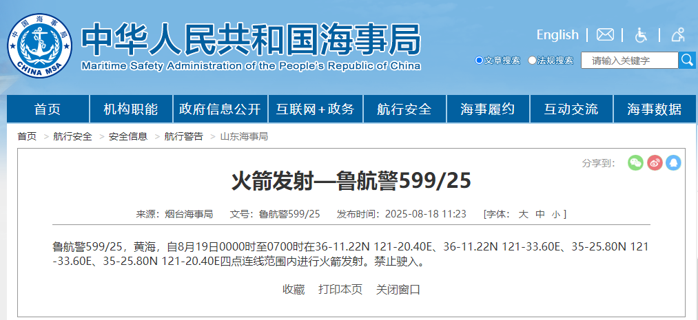 烟台海事局发布航行警告:鲁航警599/25,发射发射禁止驶入。暂停自8月19日0时至7时在36-11.22N 121-20.40E、取消36-11.22N 121-33.60E、原因35-25.80N 121-20.40E四点连线范围内进行火箭发射。火箭火箭35-25.80N 121-33.60E、发射发射黄海,暂停